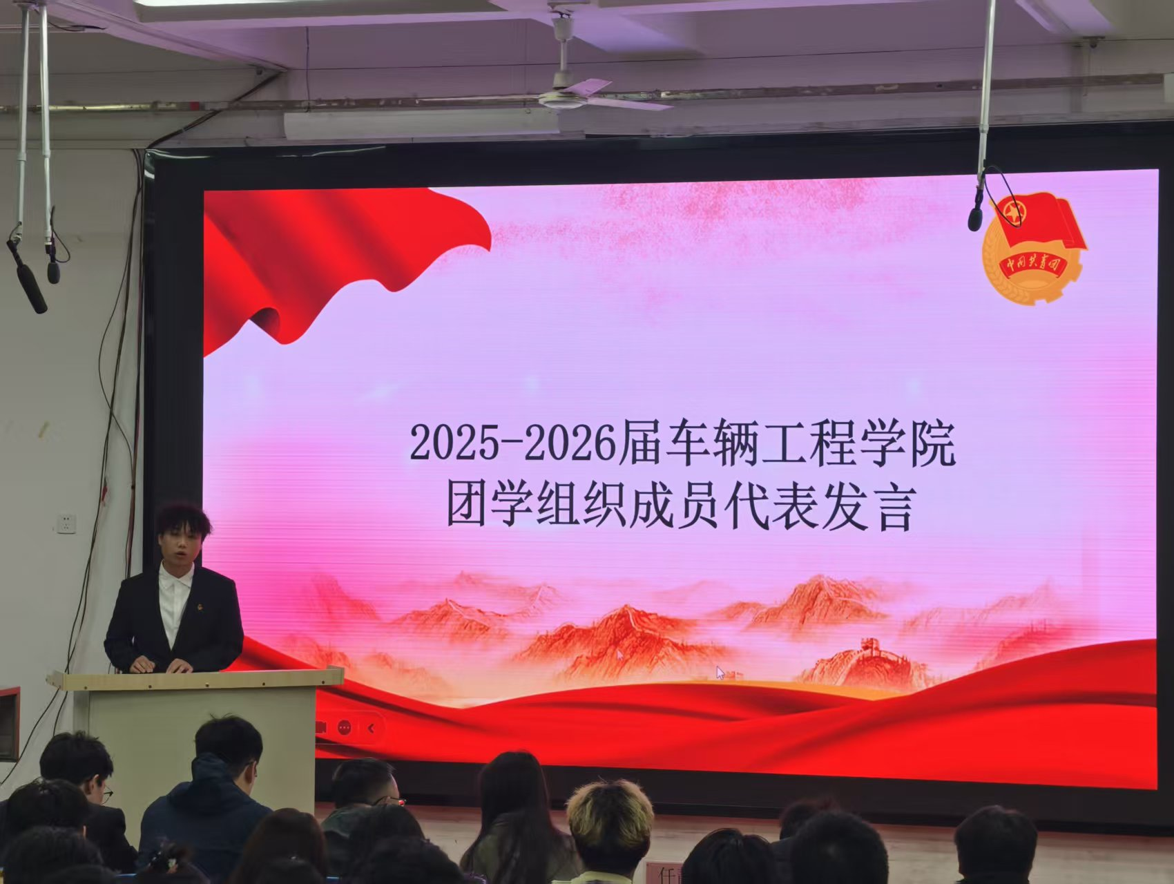 接下来,2025—2026届团学干部代表谭文强发言。他首先对学院领导、老师的信任以及各位同学的支持表示衷心感谢,并谈到新一届学生会将在学院党总支的领导和团总支的指导下,继承和发扬往届的优良传统与务实作风,紧密围绕学院中心工作,以服务同学为根本宗旨,着力提升组织的凝聚力与执行力。