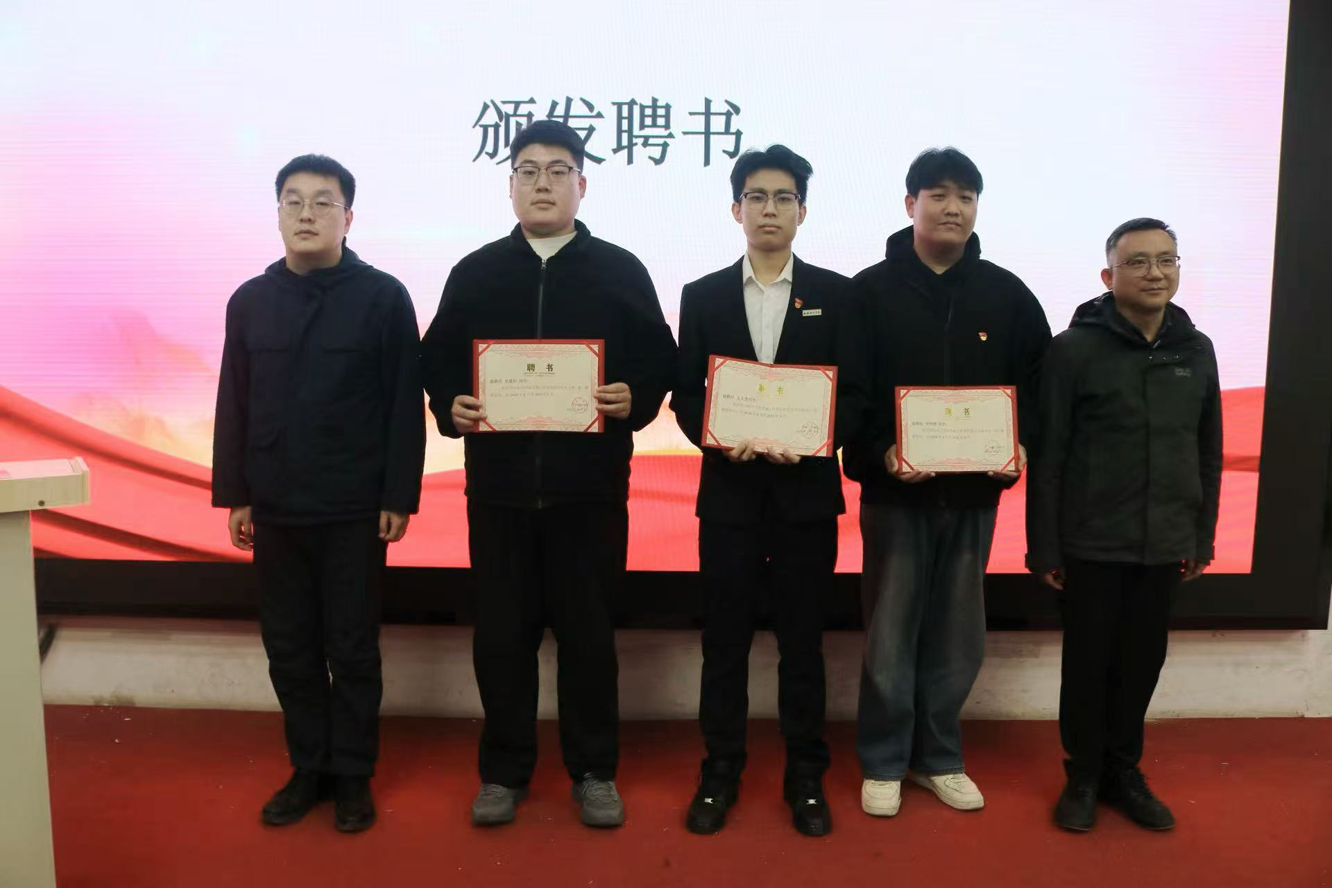 随后,周小勇与刘雨辰共同为上一届团学干部颁发聘书并合影留念。这份聘书既是对他们过去一年辛勤付出的充分肯定,更是对其为学院发展和同学服务所做贡献的高度赞誉。