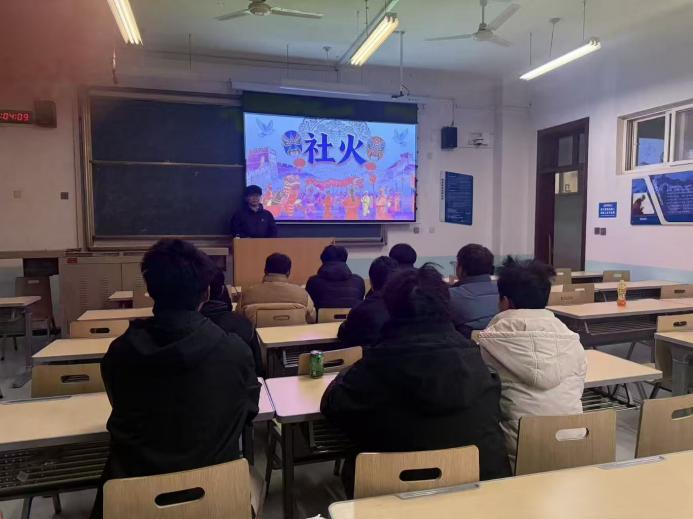 活动伊始,社团社长刘瑞豪围绕“社火里的文化密码”展开系统讲解。在首次活动的基础上,本次内容进一步聚焦技艺细节与文化内涵:从社火脸谱“红忠绿勇、黑刚白奸”的色彩象征意义,到高跷、芯子等表演形式中蕴含的民间智慧,再到陕西社火与当地历史文化的深刻关联。讲解者通过图片、短视频等多种形式,将民俗知识转化为生动案例,帮助成员认识到社火不仅是节庆表演,更是承载集体记忆与价值观念的文化载体。