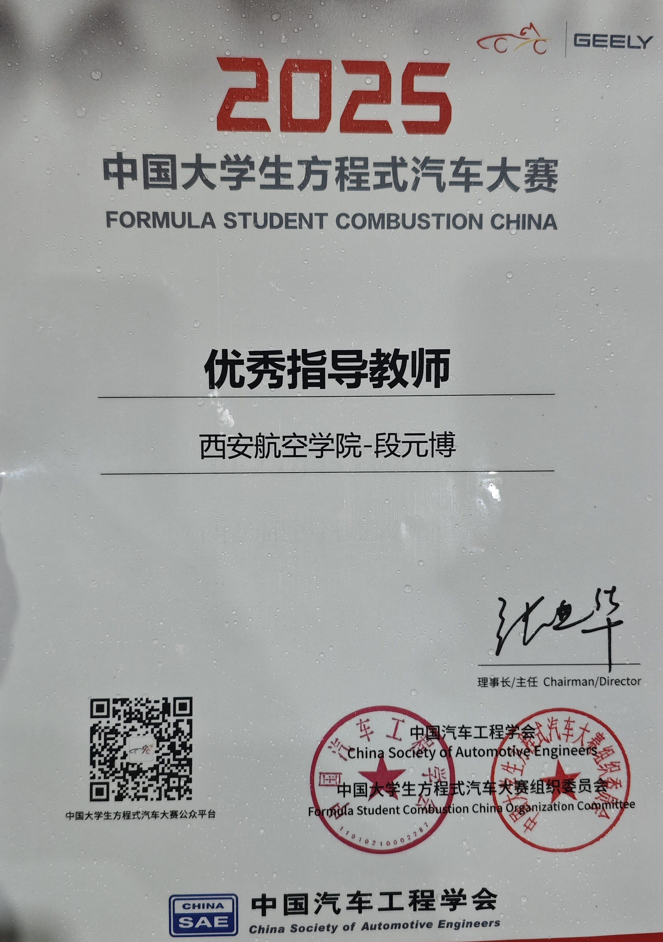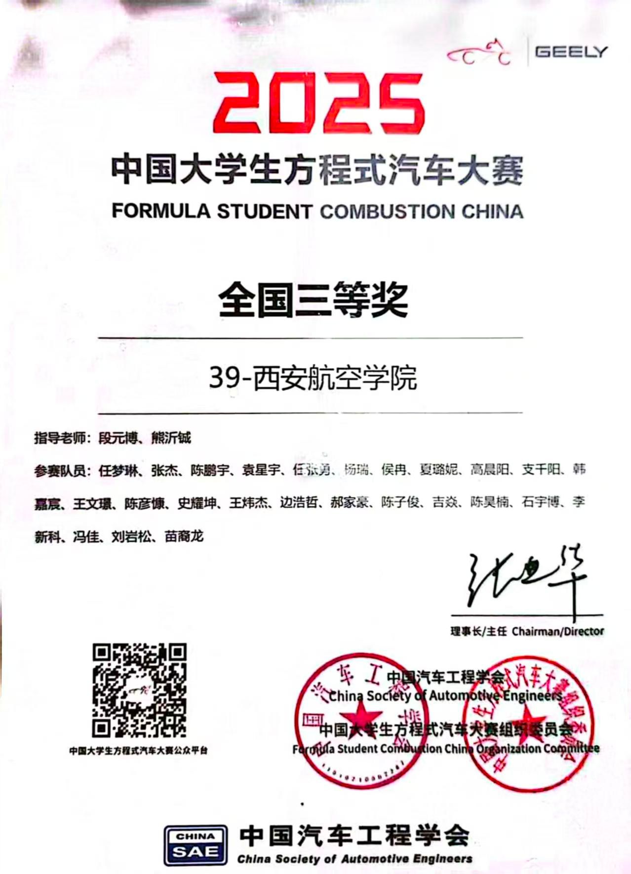2025年10月8日至12日,由中国科学技术协会指导,中国汽车工程学会和郑州市人民政府共同主办的2025中国大学生方程式汽车大赛在郑州汽检中心智能网联汽车测试基地举行。经过五天的激烈角逐,我校248cc永利集团NIRVANA方程式车队荣获全国三等奖,我校教师段元博荣获优秀指导教师。